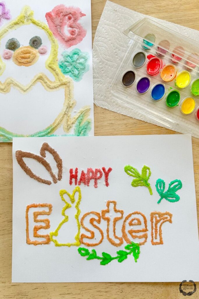 We did two different pictures. The watercolor paints were applied immediately after the glue and salt on the Easter chick painting. The second painting, the Happy Easter, we let the glue and salt dry overnight and there was far less spreading of the color.